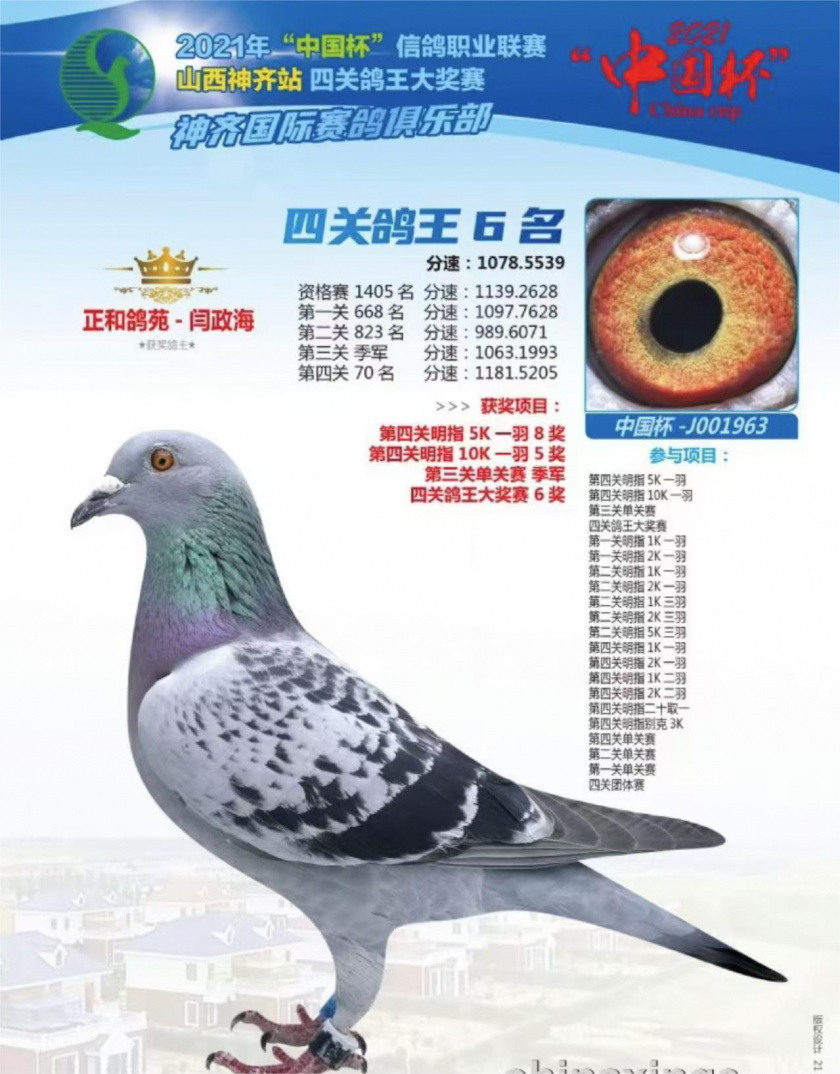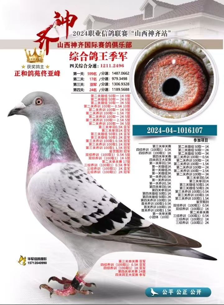 接下来的几年里更是越战越勇,在国内各大一线公棚、职业赛场,均有出色发挥。2022年宁夏龙冠赛鸽俱乐部四关综合鸽王9名等,北京松山第二关单关冠军等;2023年唐山阳光赛鸽寄养棚(春棚)四关综合鸽王季军(院内职业团队四关综合鸽王总亚军)等,山西神齐赛鸽俱乐部四关综合鸽王27名等,北京长阳赛鸽俱乐部单关6名、7名,三关鸽王季军等,唐山坤鹏赛鸽公棚430公里5名,唐山阳光国际赛鸽公棚大棚第二关400公里9名,北京松山赛鸽俱乐部四关综合鸽王26名,香河祥泰赛鸽俱乐部双关鸽王6名等。2024年山西神齐两次单关亚军、四关综合鸽王总季军、57名等综合入围7羽;北京长阳第一关亚军、10名等;与此同时,正和鸽苑分享鸽友的实战赛鸽也是捷报频传,屡创佳绩。